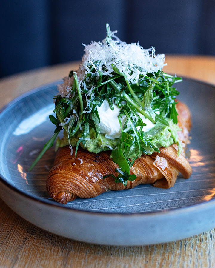 Grillad croissant, avokado smash med inlagd citron, pocherat ägg, ruccola, parmesan