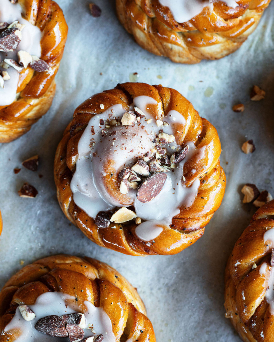 100% växtbaserad bulle. Vetebulle med mandel- fyllning. Toppad med glasyr & rostade mandlar
